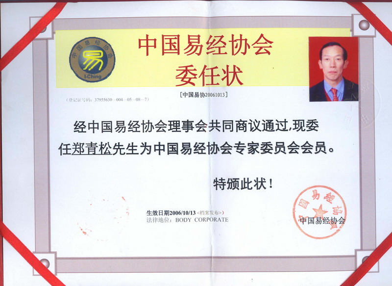 鄭青松老師委任為《中國易經(jīng)協(xié)會》 專家會員,查看大圖>> |