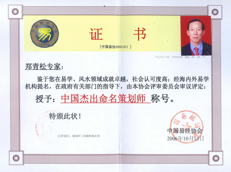 | 《中國易經(jīng)協(xié)會》授予鄭青松 《中國杰出命名策劃師》 稱號,查看大圖>> |