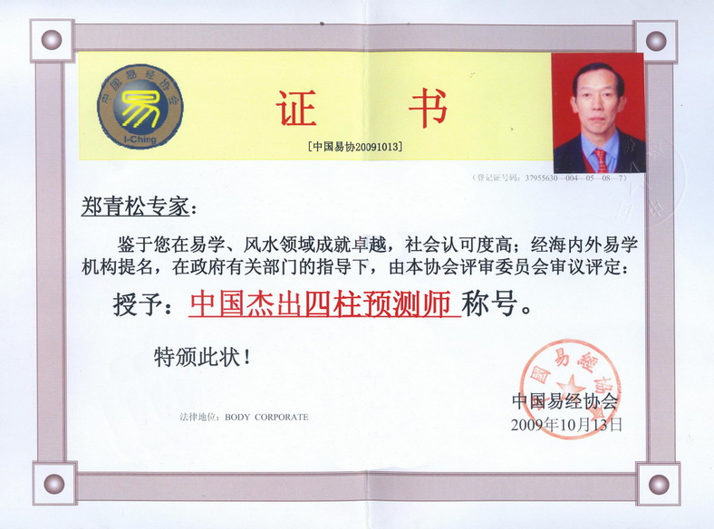 《中國易經(jīng)協(xié)會》授予鄭青松 《中國杰出四柱預(yù)測師》稱號, 查看大圖>> |