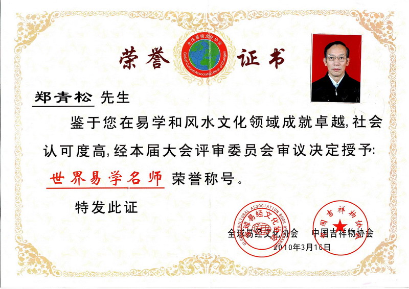 《全球易經(jīng)文化協(xié)會》授予鄭青松 《世界易學(xué)名師》稱號, 查看大圖>> |