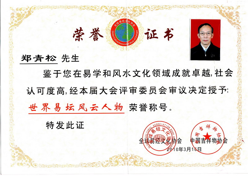 | 《全球易經(jīng)文化協(xié)會》授予鄭青松 《世界易學(xué)命理創(chuàng)新行業(yè)先峰》稱號, 查看大圖>> |