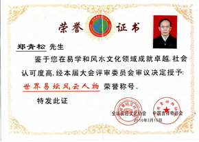 《全球易經(jīng)文化協(xié)會》授予鄭青松 《世界易壇風(fēng)去人特》稱號, 查看大圖>> |